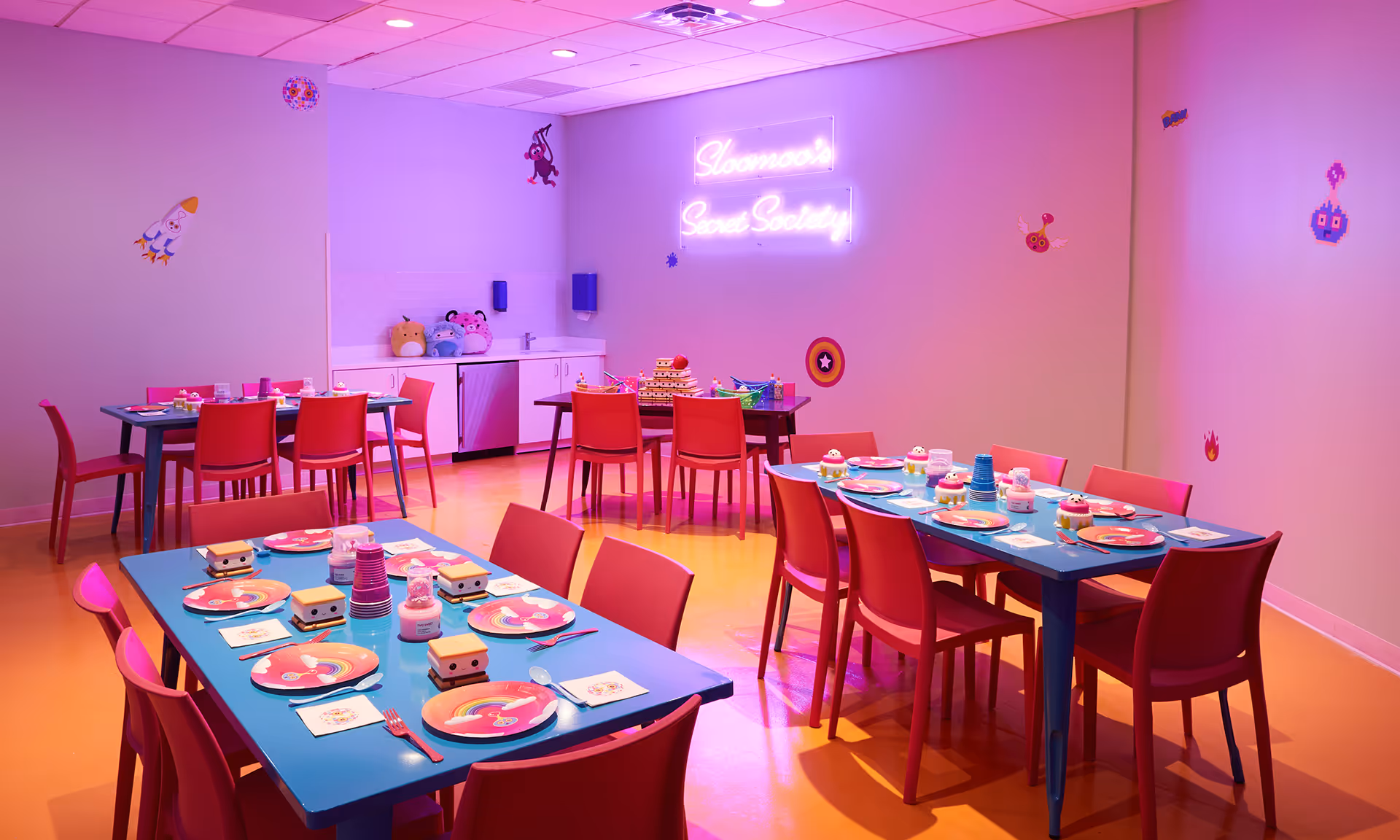A dreamy private party room, bursting with color, neon, and cuteness. We’ll make your slimiest wishes come true!
