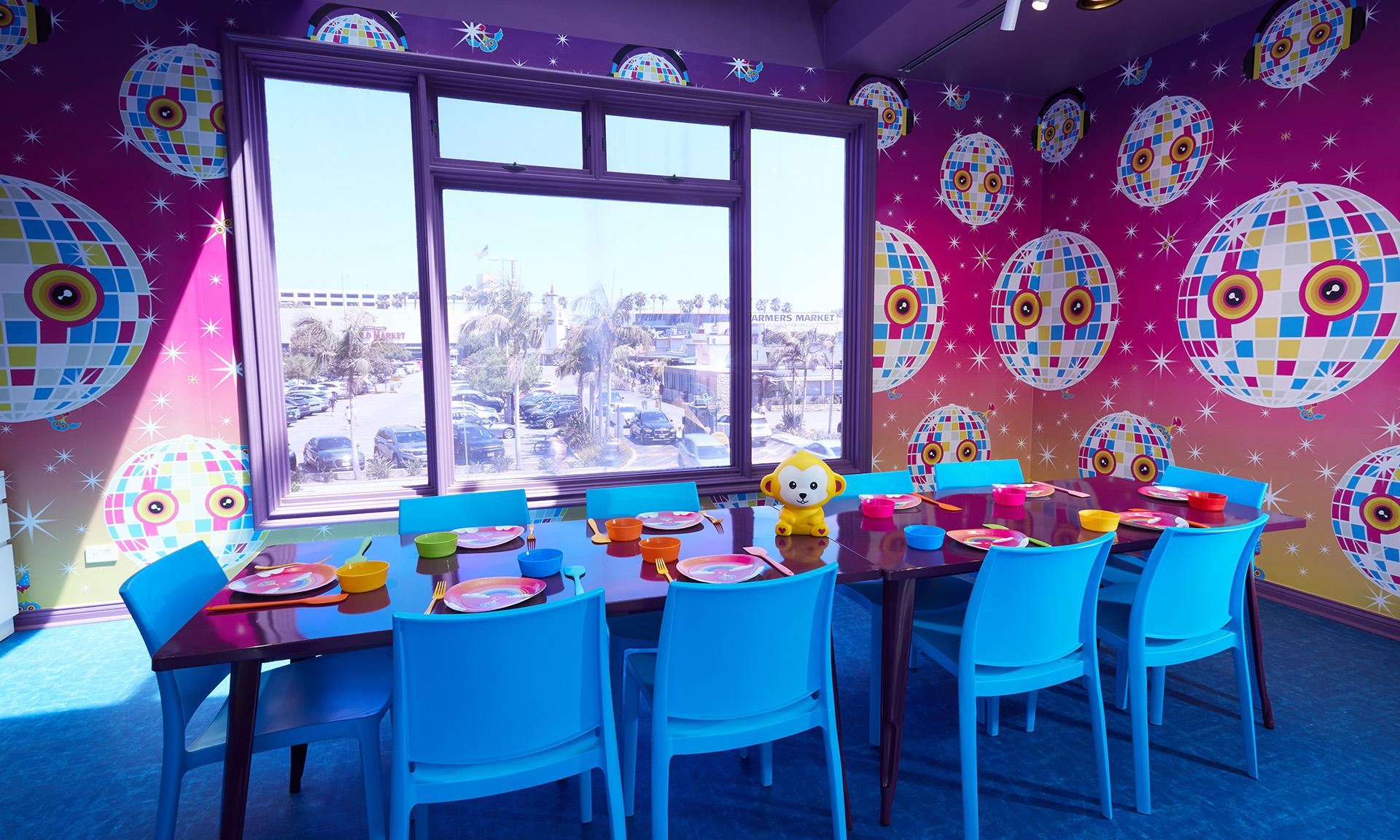 A private party room, inspired by Malibu. The perfect spot for making slime, eating cake, and play.
