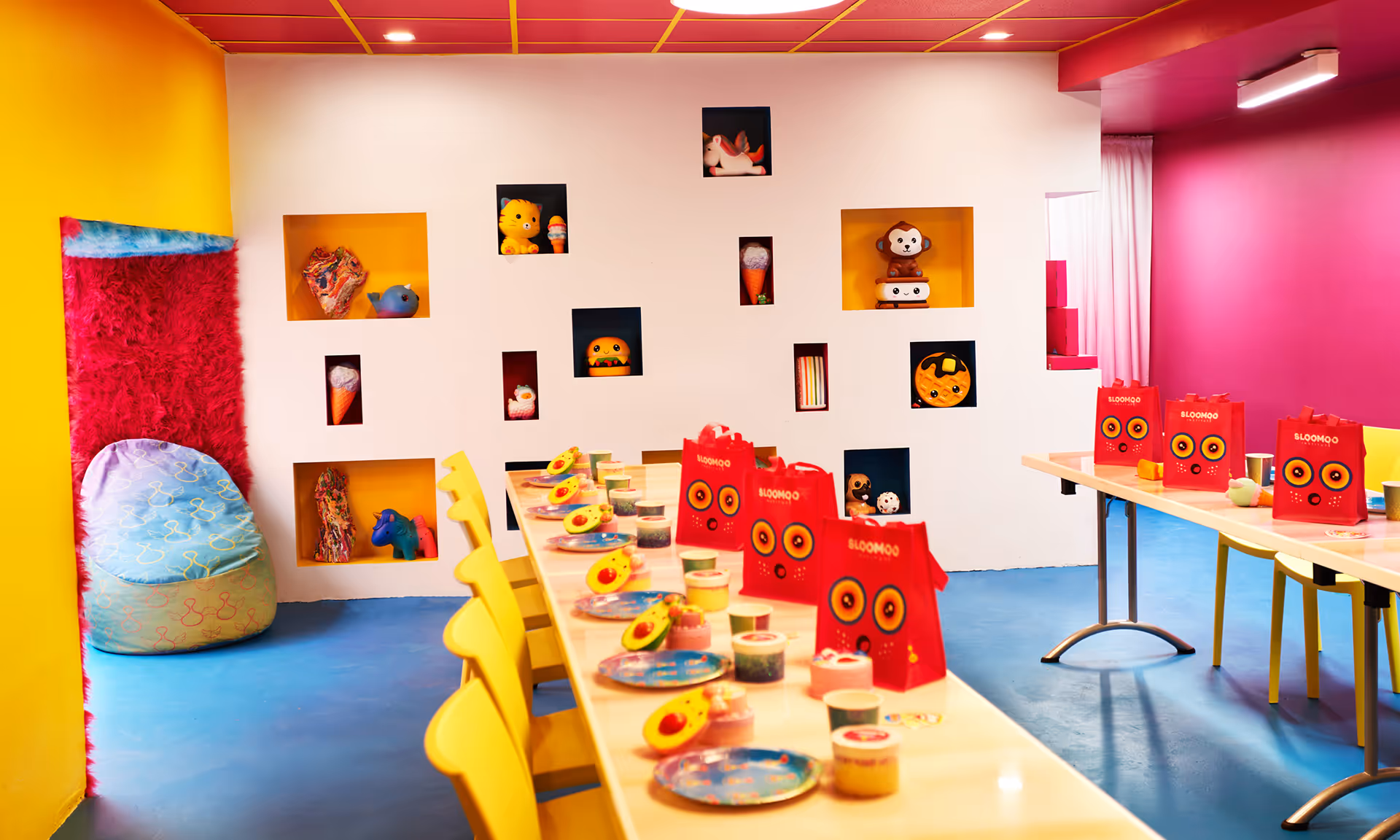 A private party room, bursting with color. The perfect spot for making slime, eating cake, and opening gifts.